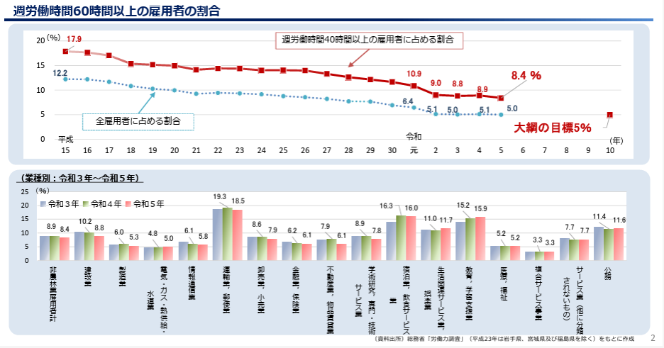 厚生労働省の資料によると、近年、週60時間以上働く労働者の割合は減少傾向にあるものの、依然として全体の5%以上を占めており、長時間労働の問題は解消されたとは言えない状況にあります。