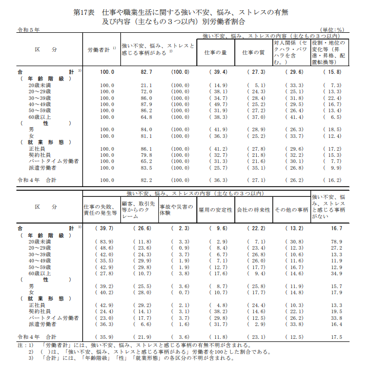 近年、多くの労働者が職場で強いストレスを抱えており、メンタルヘルスの問題が深刻化しています。厚生労働省の「令和5年労働安全衛生調査(実態調査)」によると、仕事や職業生活に関して強い不安や悩み、ストレスを感じている労働者の割合は82.7%にも上ると報告されています。また、具体的なストレス要因として「仕事の失敗、責任の発生等」(39.7%)、「仕事の量」(39.4%)、「対人関係(セクハラ・パワハラを含む)」(29.6%)などが挙げられており、多くの労働者がさまざまな理由でストレスを抱えていることが分かります。