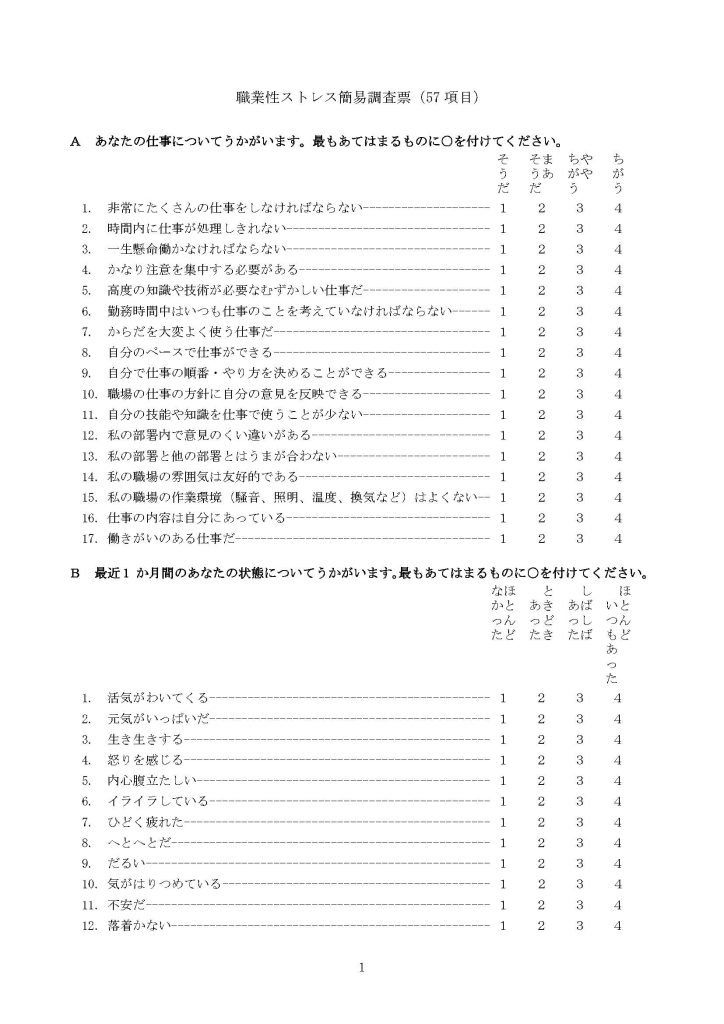 ストレスチェックには複数の質問票がありますが、一般的には厚生労働省が示す「職業性ストレス簡易調査票(57項目)」が広く用いられています。
