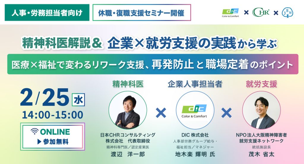 | タイトル | 人事・労務担当者のための休職・復職支援セミナー ― 医療×福祉で変わるリワーク支援 再発防止と職場定着のポイント ― |